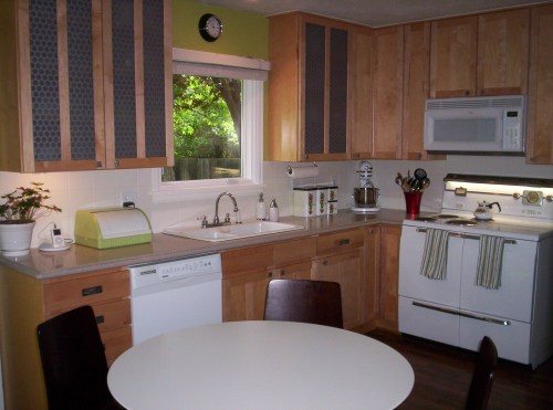 - Retro-style kitchen with light maple cabinets and engineered stone counters.