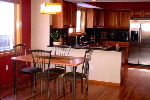 - Contemporary kitchen with maple cabinets and granite countertops.